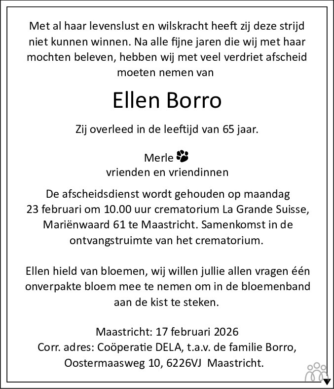 Veel te vroeg Ellen ....,.je zal zo welkom zijn in de hemel en ook de hondenhemel........ik vergeet nooit de woorden na onze woninigbrand dat je ons wilde helpen je was een schat van een mens....... niet alleen voor dieren maar ook voor mensen.....,ik hèb er geen woorden voor maar ik weet nog goed dat ik zei van PiP een snelle mokken dat je het niet begreep..... en toen ik zei een mooi meisje zei je toen ik dacht..Ellen je bent nu naar de overkant...... Maar vergeten doen we je niet..........ooit zien we elkaar terug